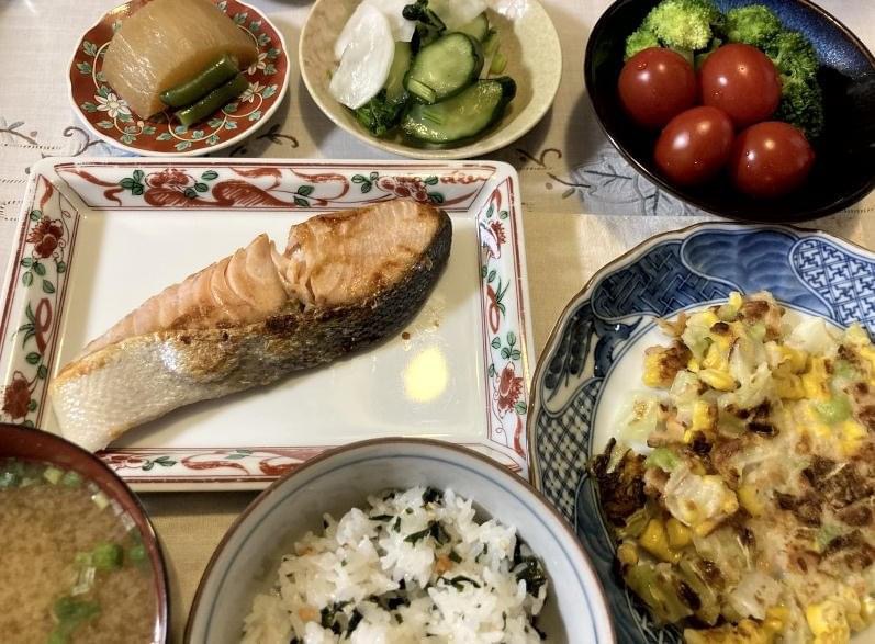19:30 わかめご飯、焼鮭、大根煮、