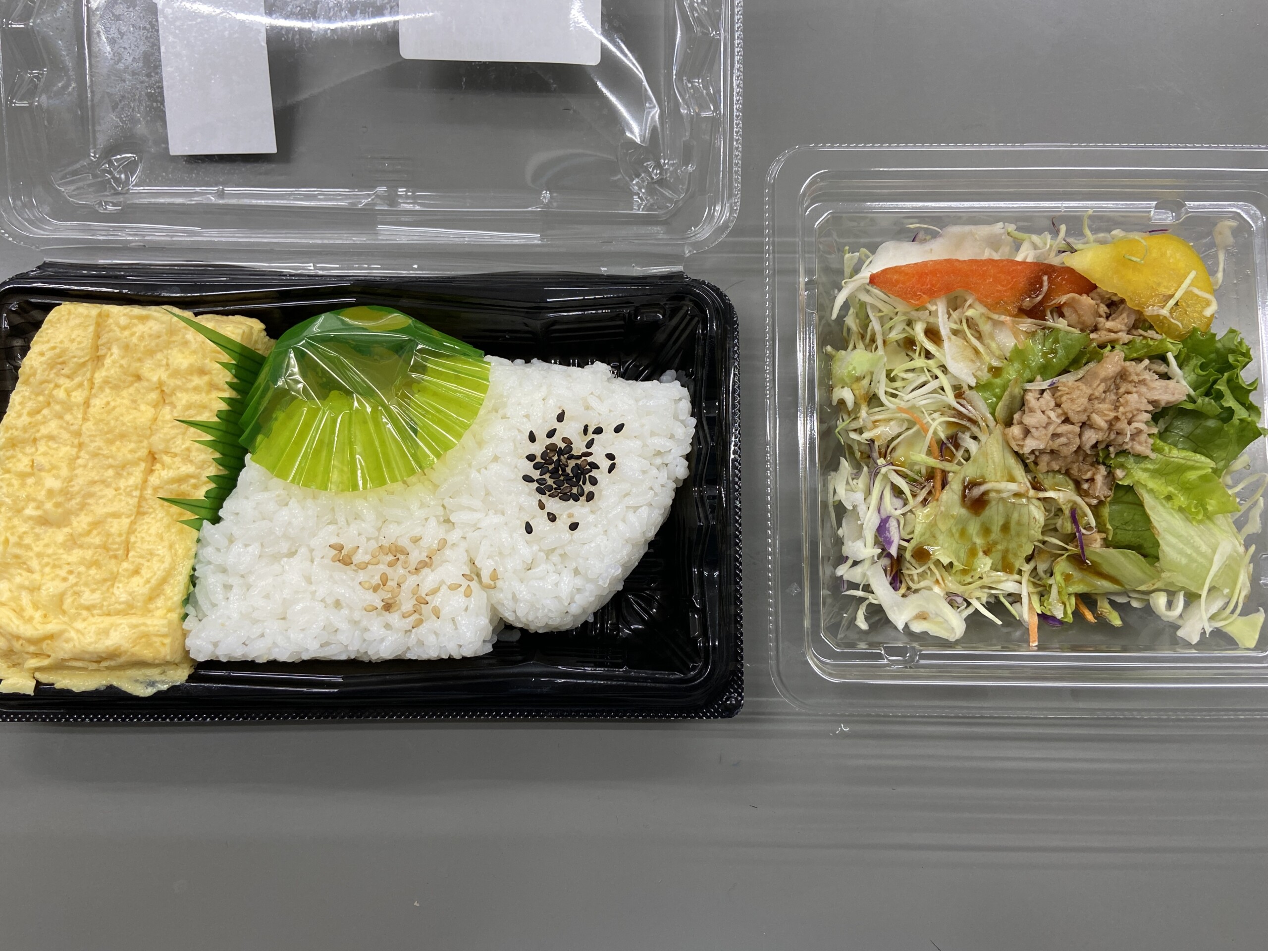 食物繊維ドリンク、おにぎり2個、出汁巻、お漬物、サラダ(中華ドレッシング)、サプリ
