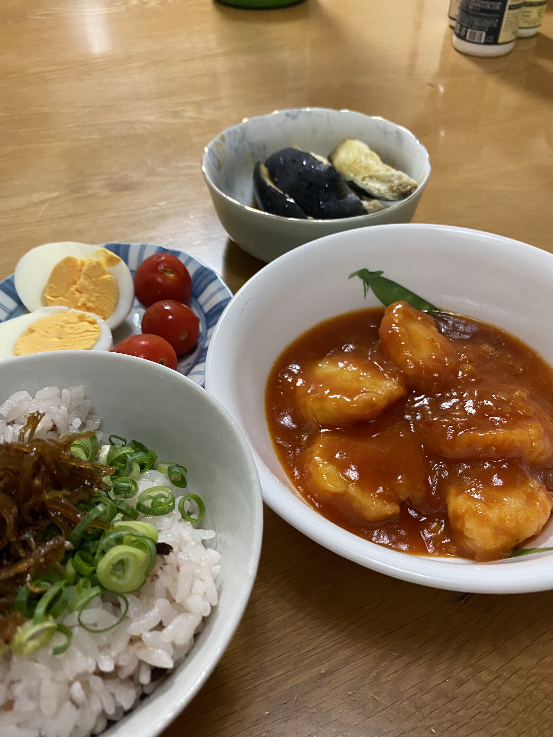 夕食 ファイバー&プロティン、エビチリ、発酵玄米ねぎくぎ煮のせ、水ナス、ゆで卵、プチトマト、そうめん(2口)+サプリ