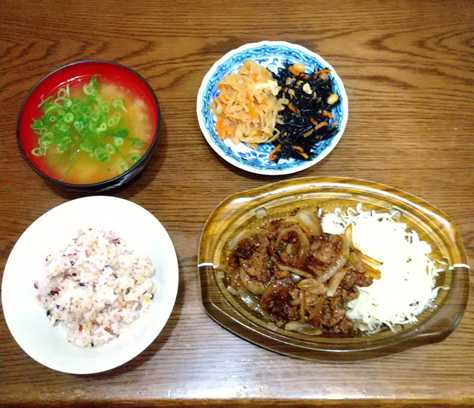 18:30:サプリ、十六穀米、千切大根、ひじき、焼肉、キャベツ、お味噌汁