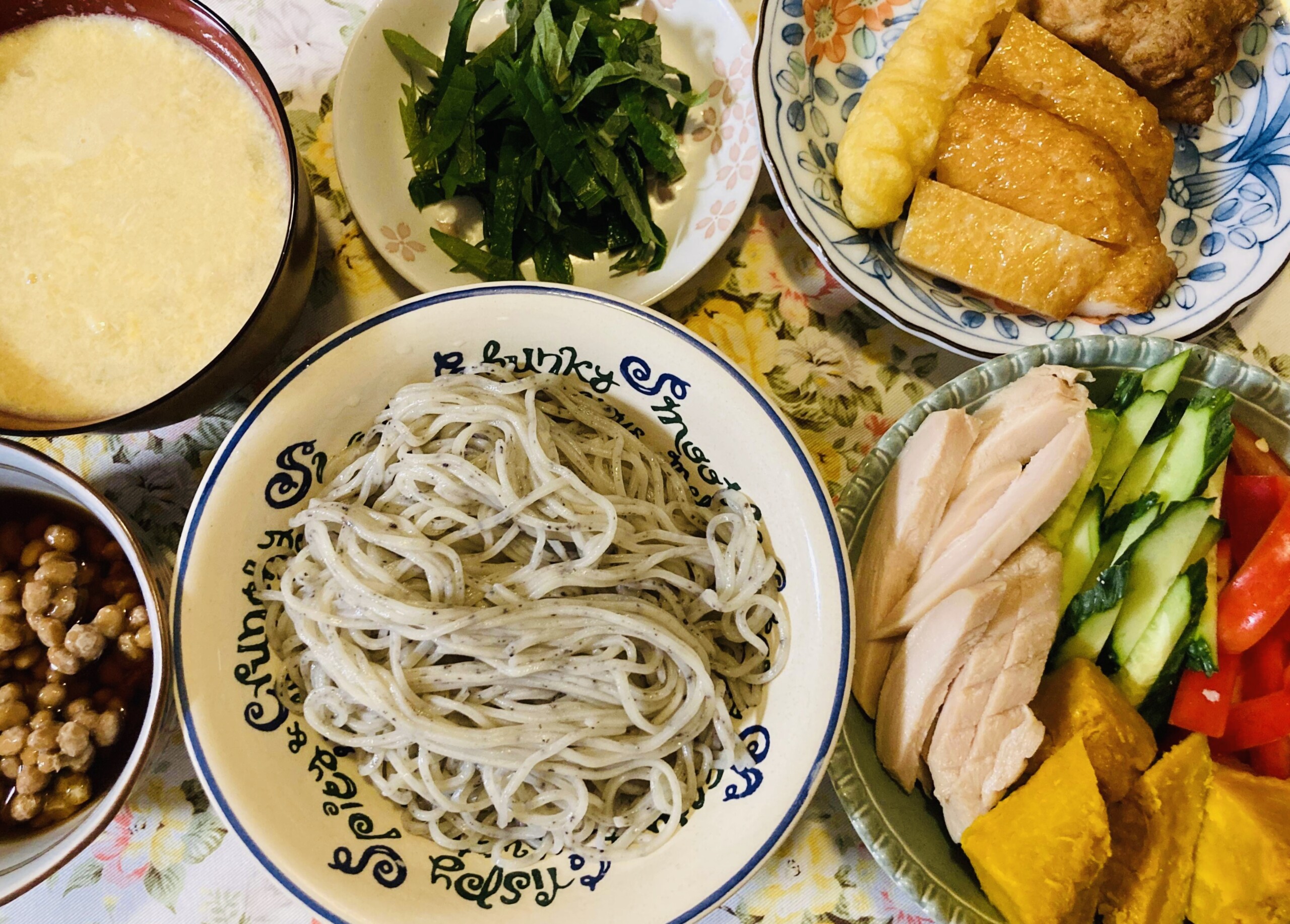 19:00 胡麻蕎麦、納豆、大葉、ネギ玉みそ汁、