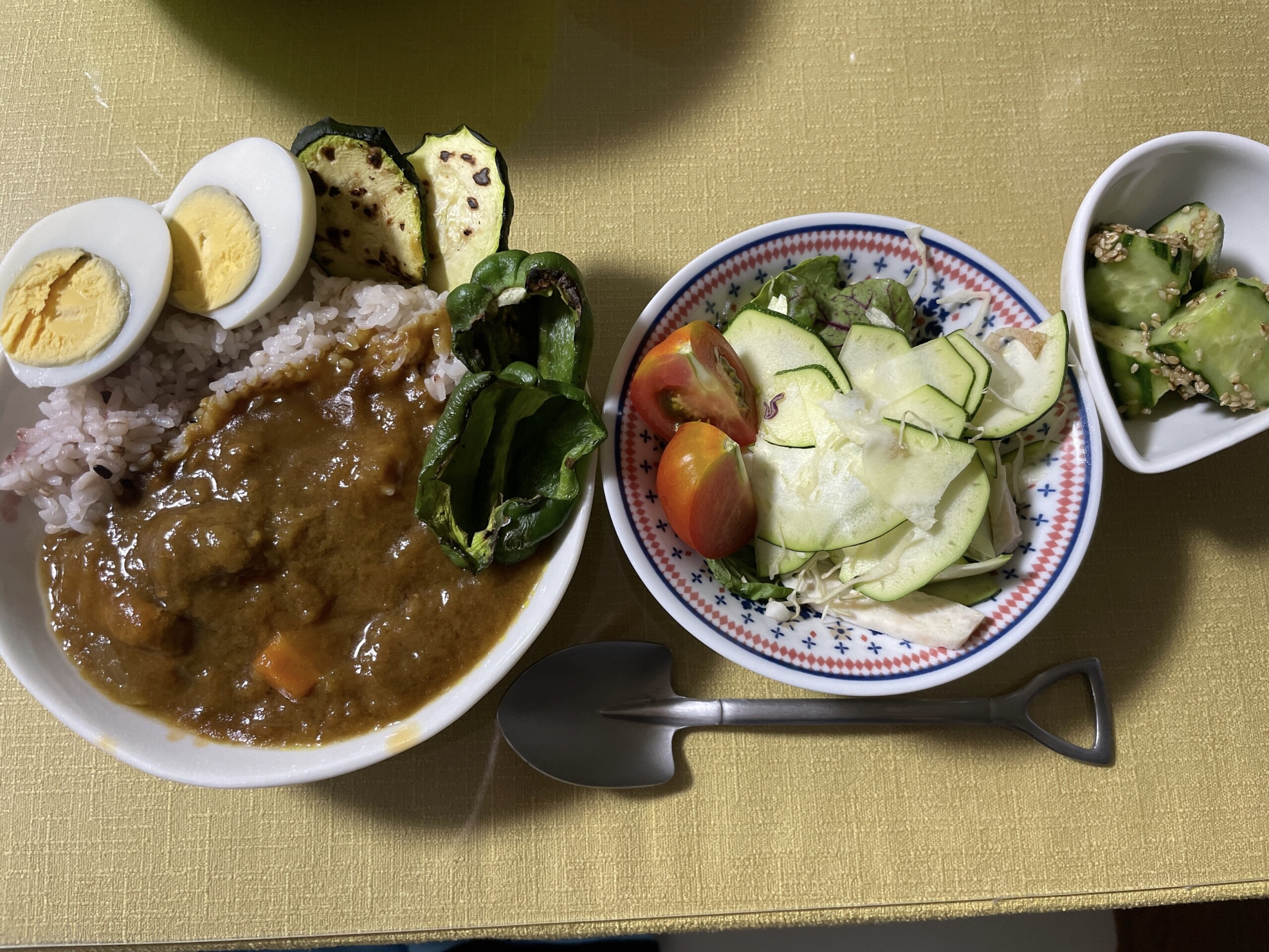 18時 カレーライス(スープカレー風)ゆで卵、ピーマン、ズッキーニ焼き