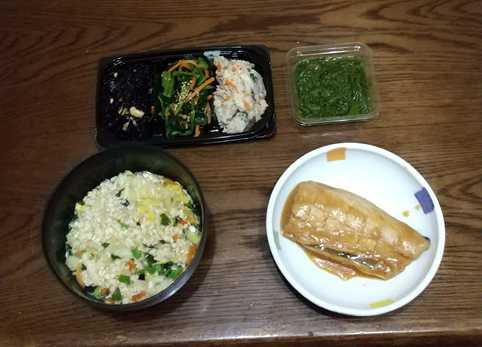 16:00:食物繊維ドリンク×2、サプリ、野菜スープリゾット風(オートミール)、めかぶ