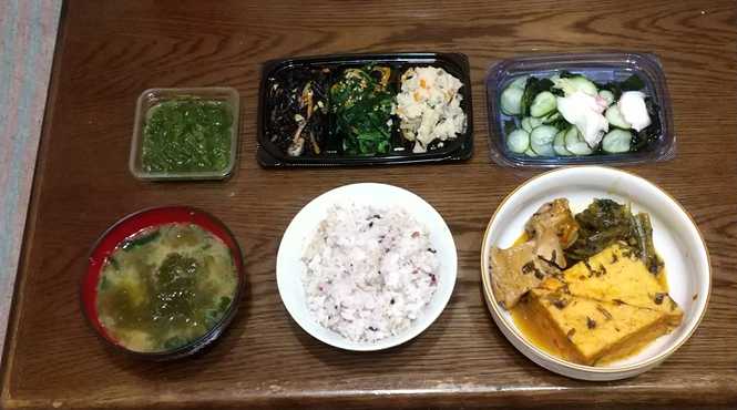 16:00:食物繊維ドリンク×2、サプリ、十六穀米、めかぶ、卯の花、ひじき,ほうれん草の胡麻和え、煮物(厚揚げ・鶏肉・春菊)、酢の物、お味噌汁