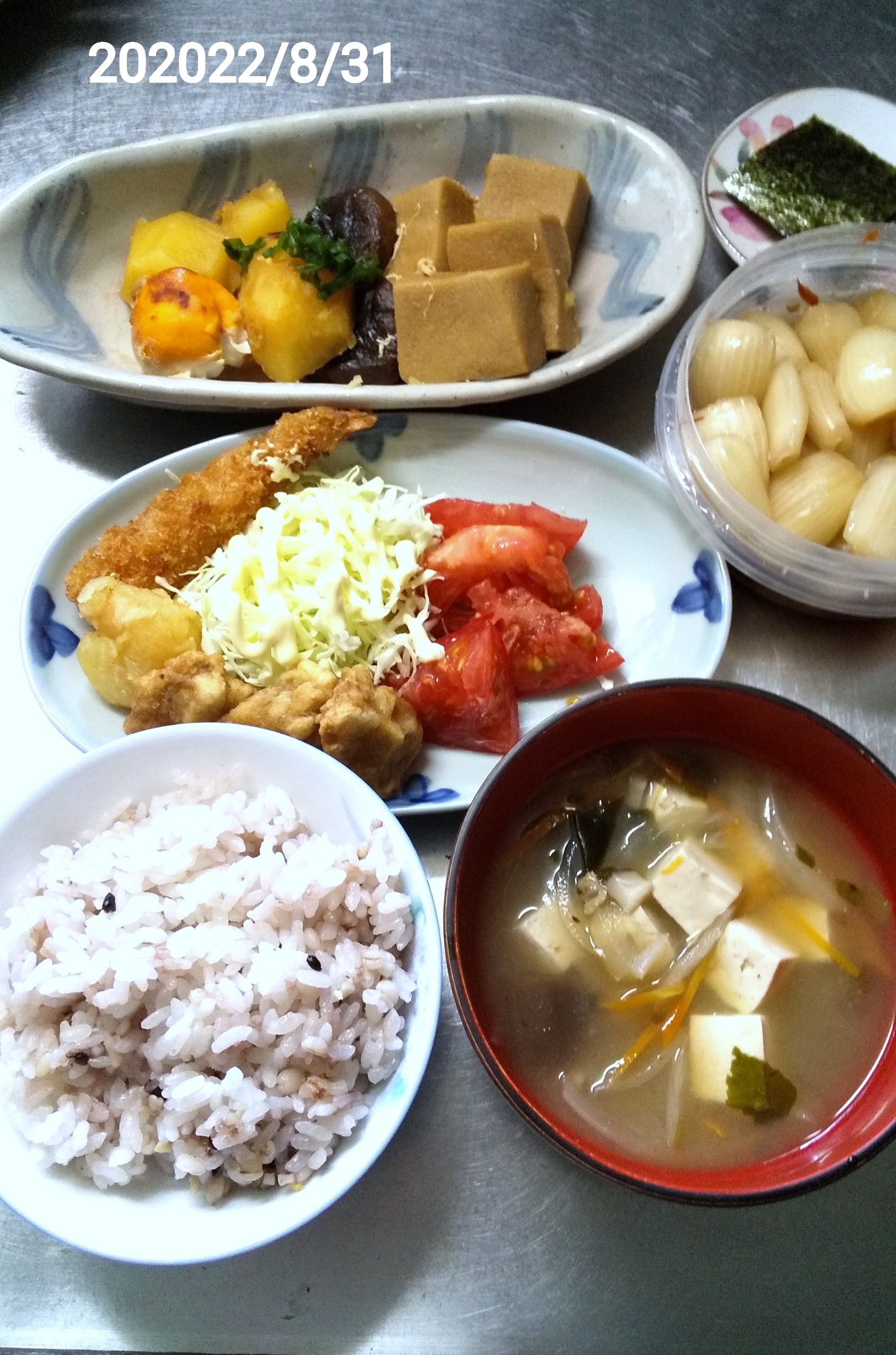 *エビフライ、唐揚げ(昨日の残り)(キャベツ、玉葱、トマト)