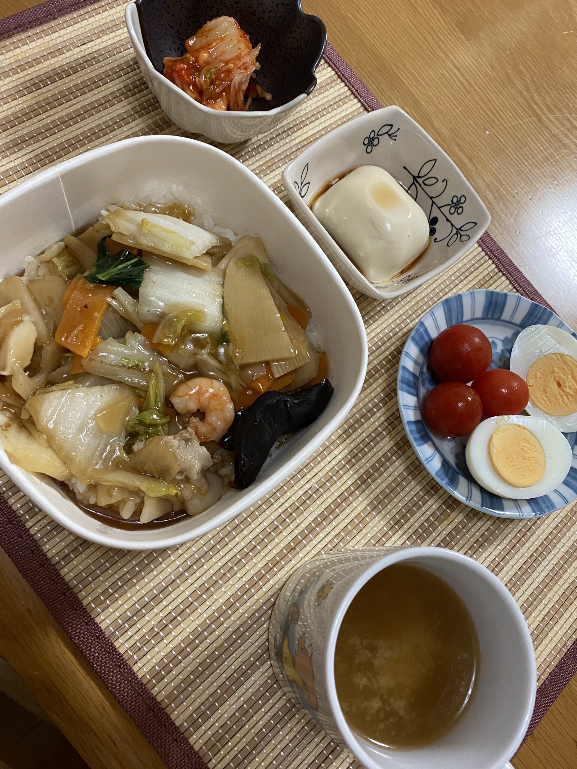 夕食 ファイバー&プロティン、中華丼、冷奴、キムチ、ゆで卵、プチトマト、あさりの味噌汁+サプリ