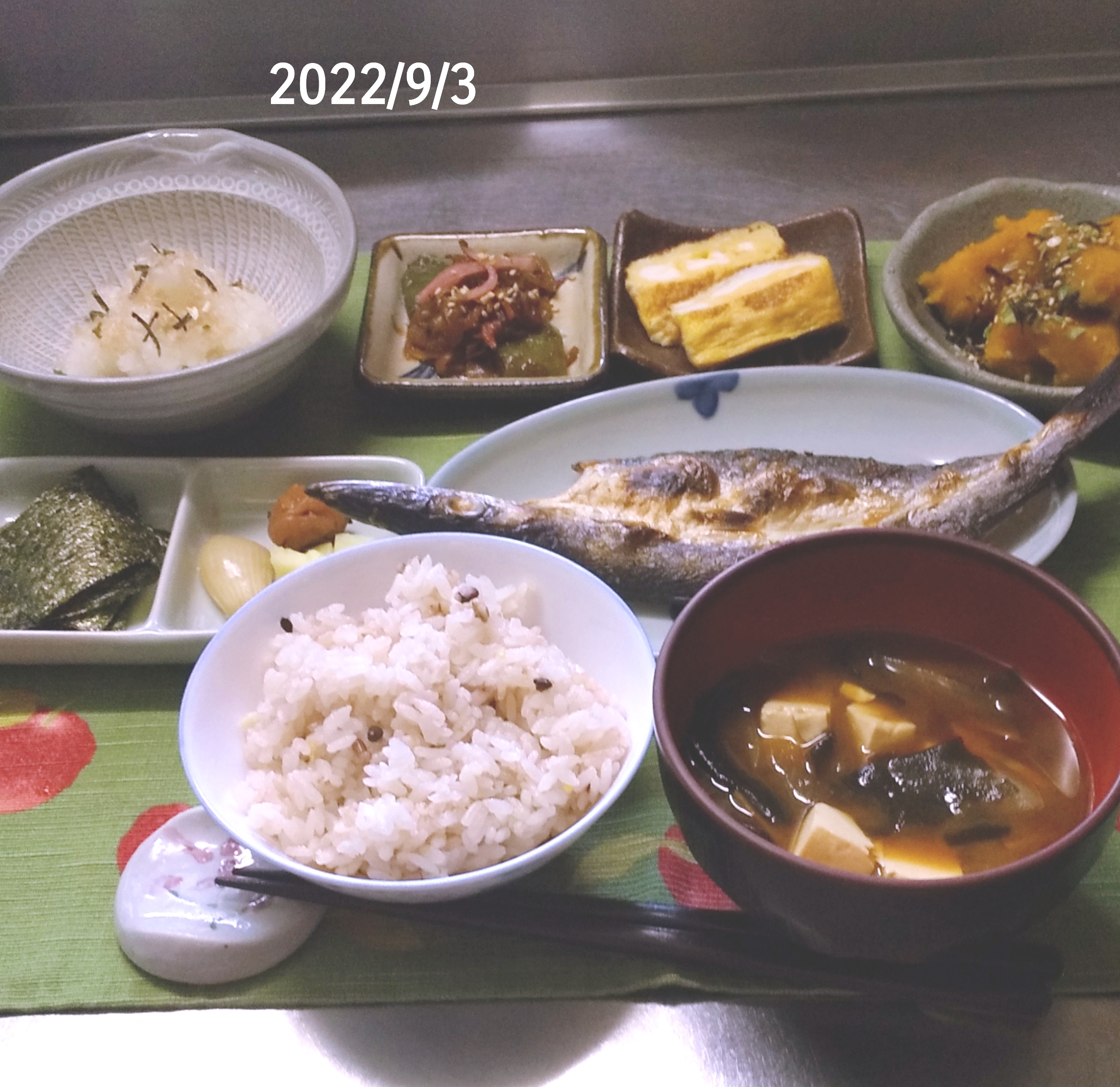 *味噌汁(若布、豆腐、玉葱、ナス)*漬物*卵焼き*カマス干物*カボチャ煮しめ*大根おろし