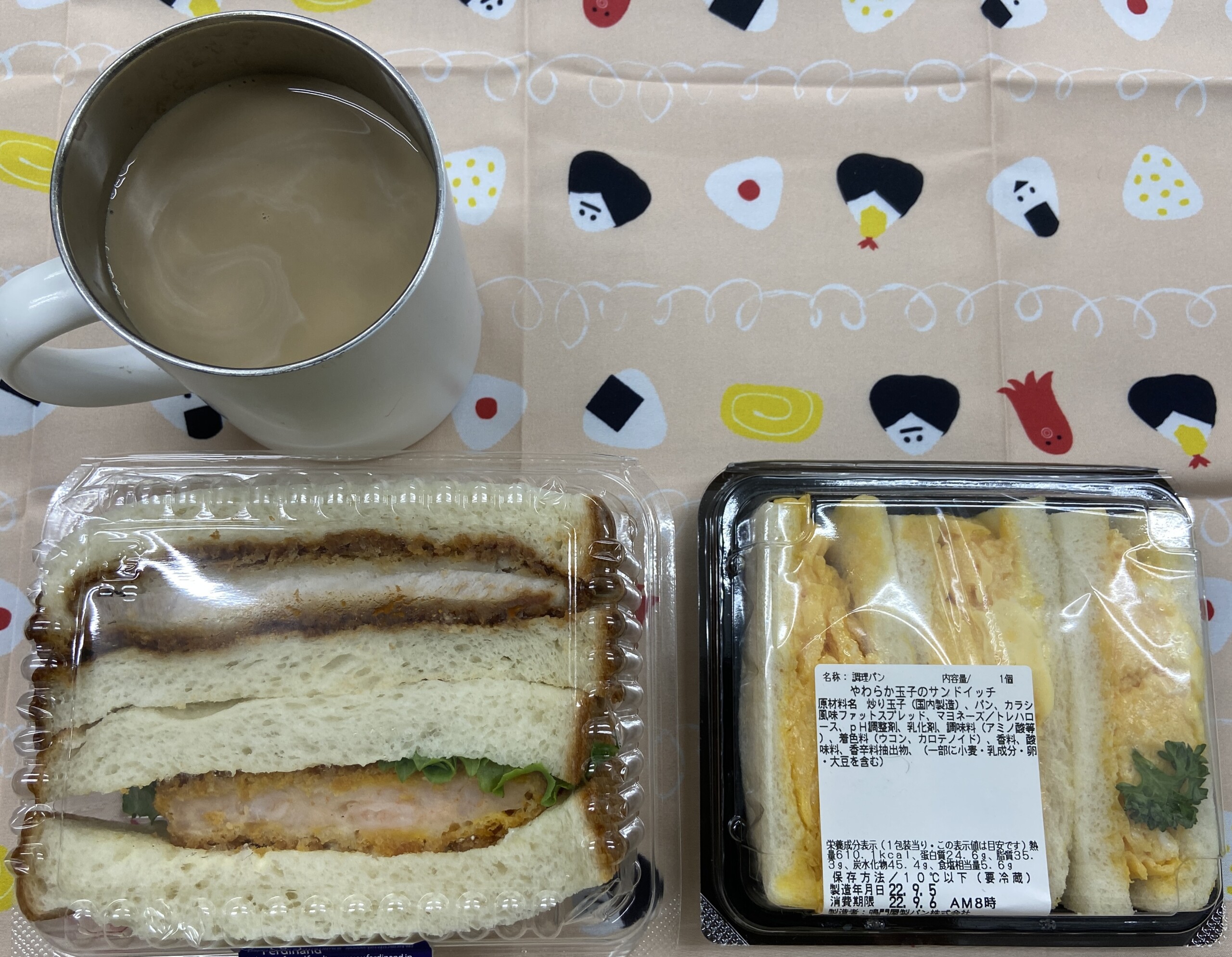 写真にはサンドイッチのパックが2つ並んでいますが、右側のたまごサンドは食べずにお持ち帰り。