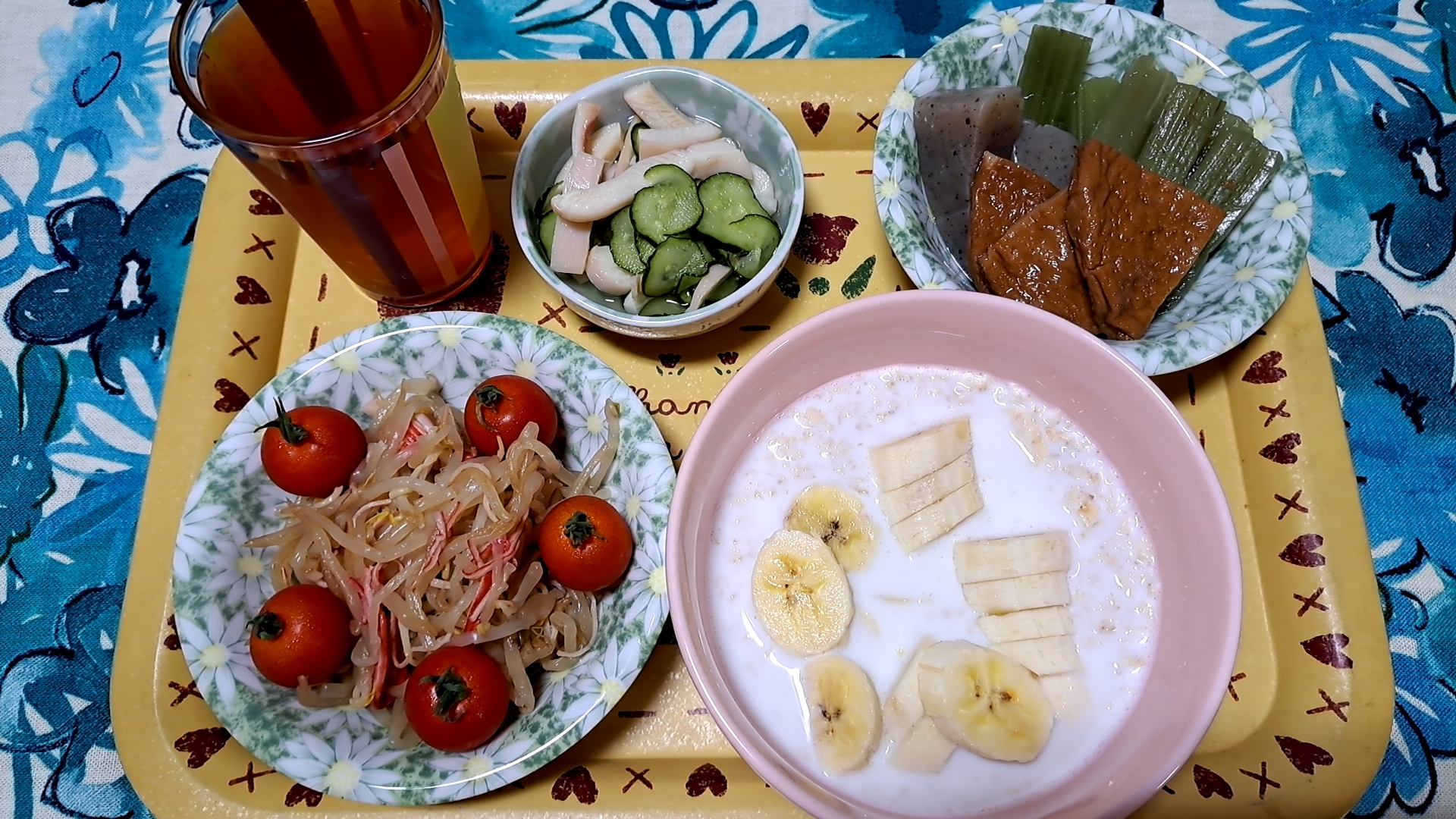 ふきとこんにゃくまるてんの煮物。オートミールのホットミルク粥にバナナ🍌を添えて。PMサプリ。ソフール