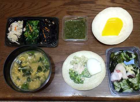 16:00:食物繊維ドリンク×2、サプリ、バナナ、中華スープリゾット風(オートミール)、めかぶ、卯の花、ひじき、沢庵、ほうれん草の胡麻和え、ブロッコリーツナ和え、お味噌汁、ゆで卵、酢の物