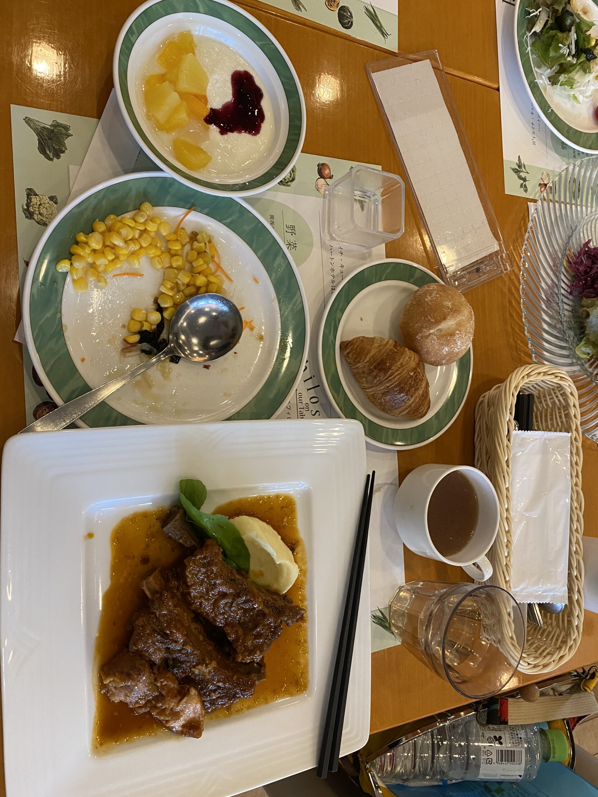 昼11:30 豚のスペアリブ煮、パン、スープ、ヨーグルト