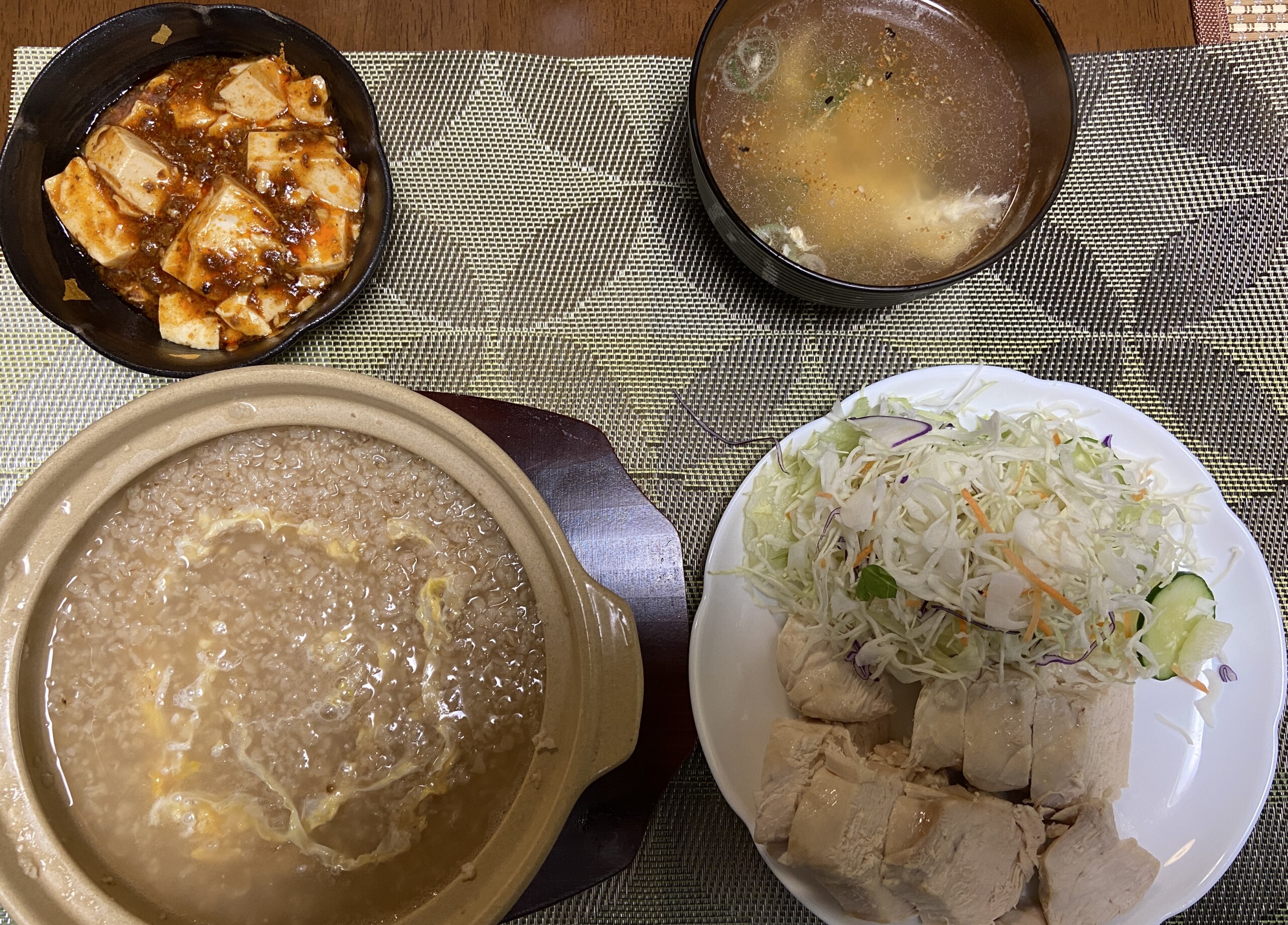 食物繊維ドリンク、オートミールの雑炊、麻婆豆腐、蒸し鶏、スープ、サプリ