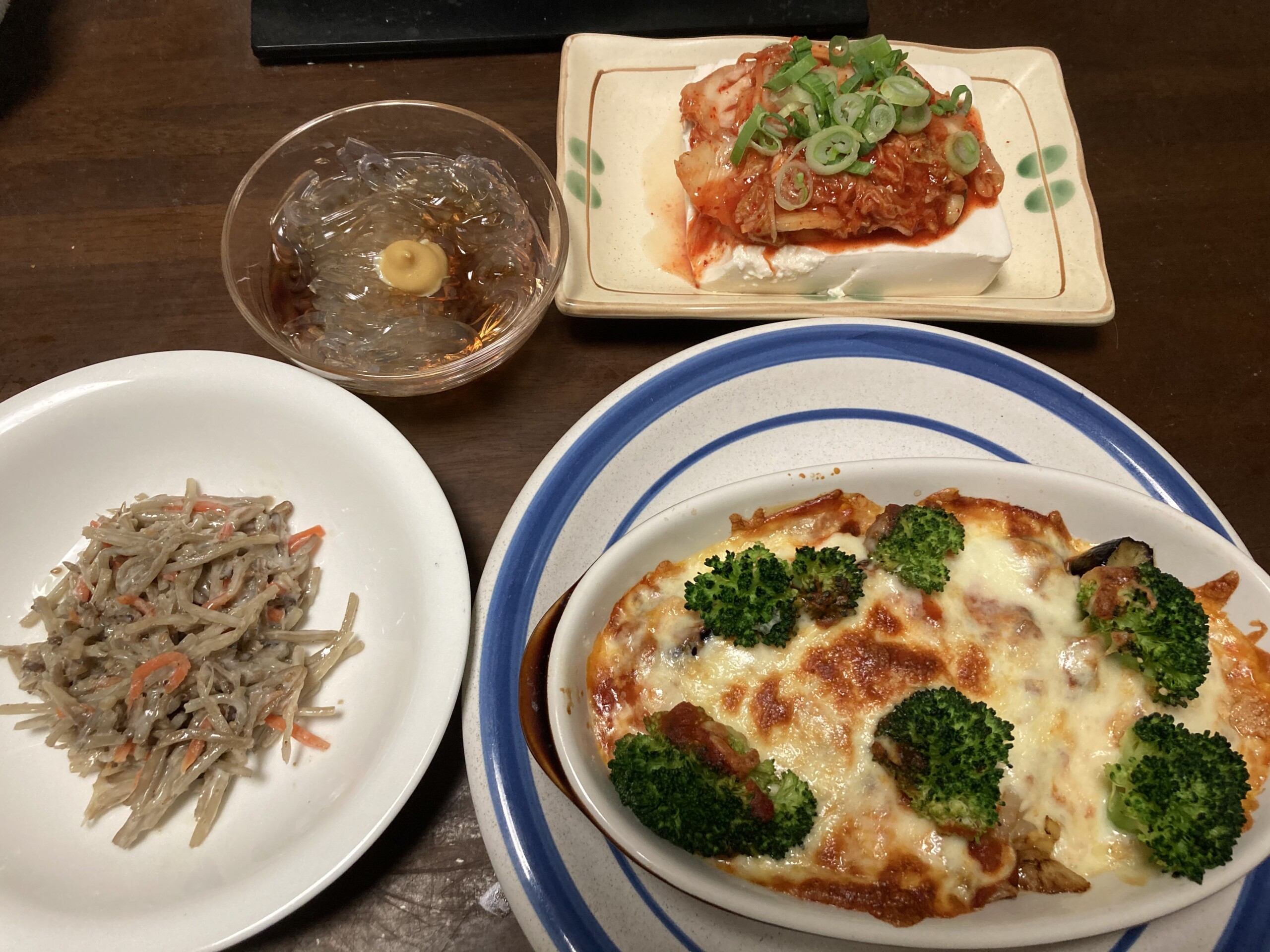 キムチ豆腐、ところてん、ごぼうサラダ、ブロッコリー🥦とナス🍆のピザ風チーズ焼き。