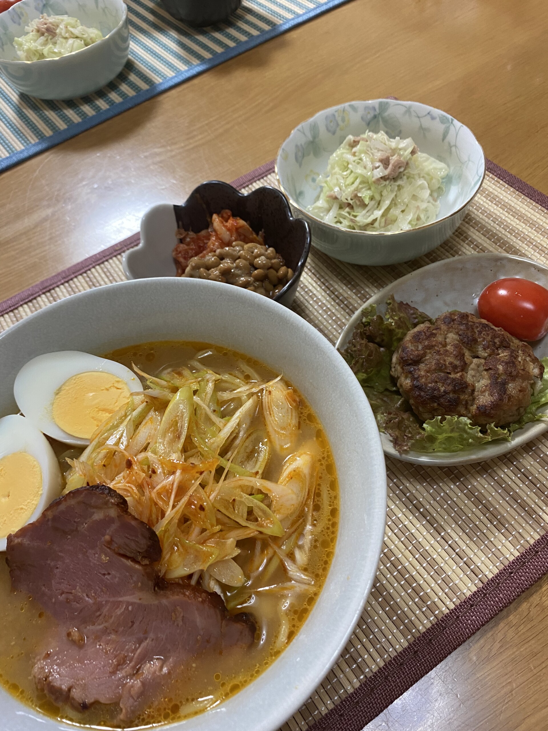 昼食 ファイバードリンク、無限きゃべつ、キムチ納豆、大豆ミートハンバーグ、味噌ラーメン(写真)+サプリ