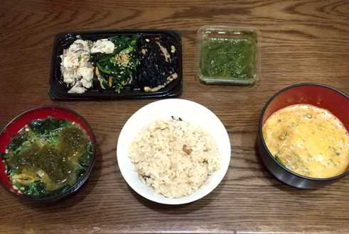 ひじき、ほうれん草の胡麻和え、納豆キムチ、お味噌汁