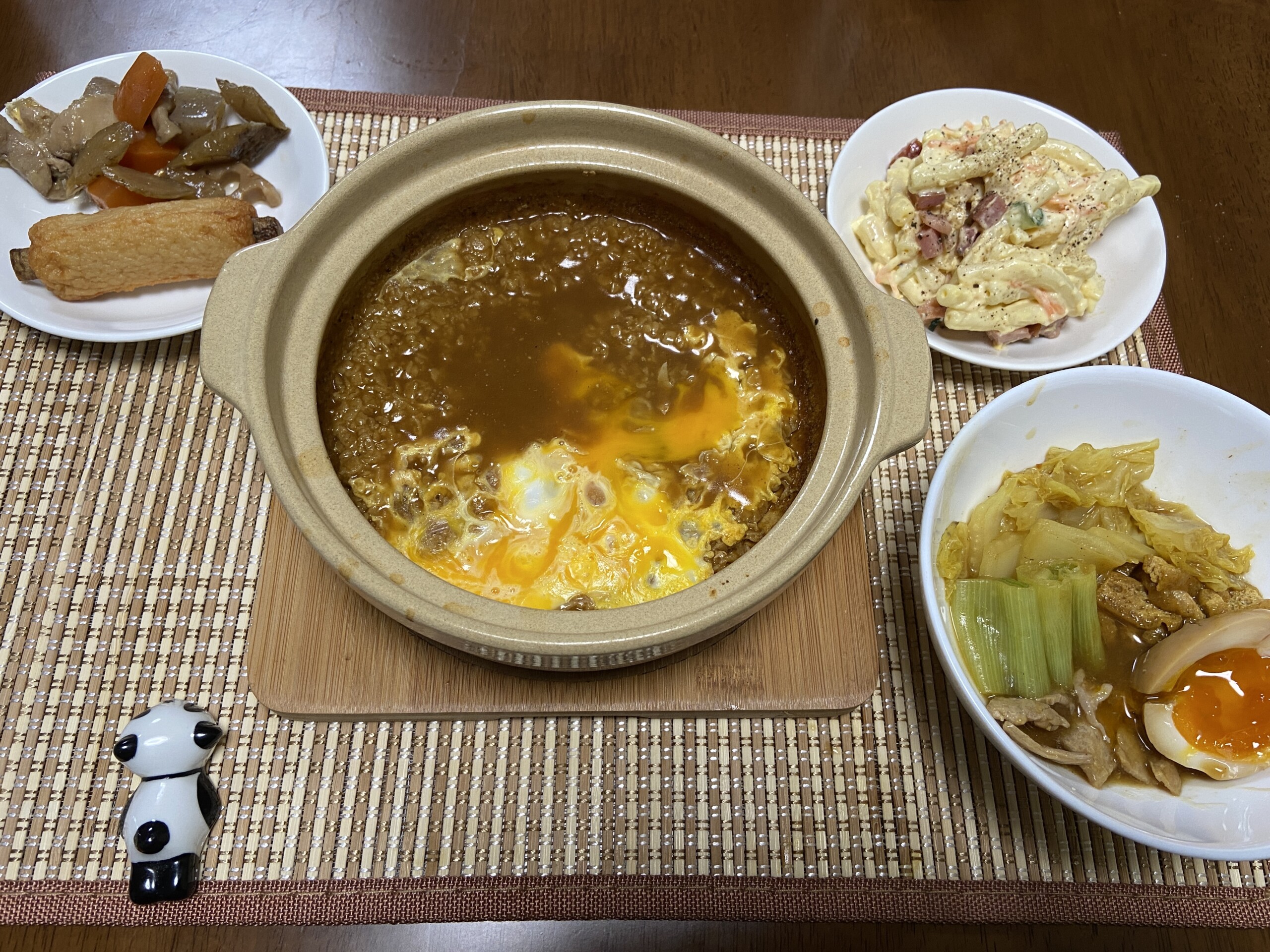 食物繊維ドリンク、オートミール雑炊(カレーうどん風)、ごぼう天、筑前煮、マカロニサラダ、野菜、あげさん、サプリ