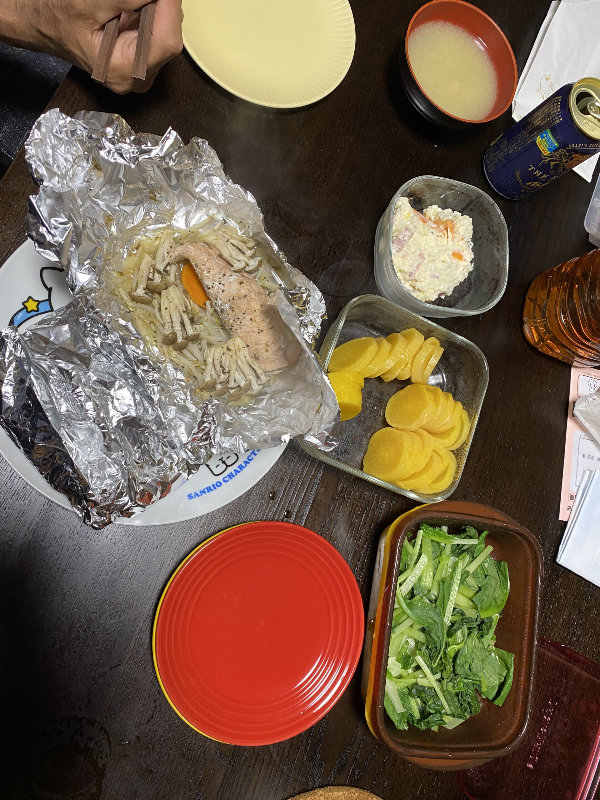 晩19:00基本のサプリ、鮭のホイル焼き、小松菜、ポテサラ