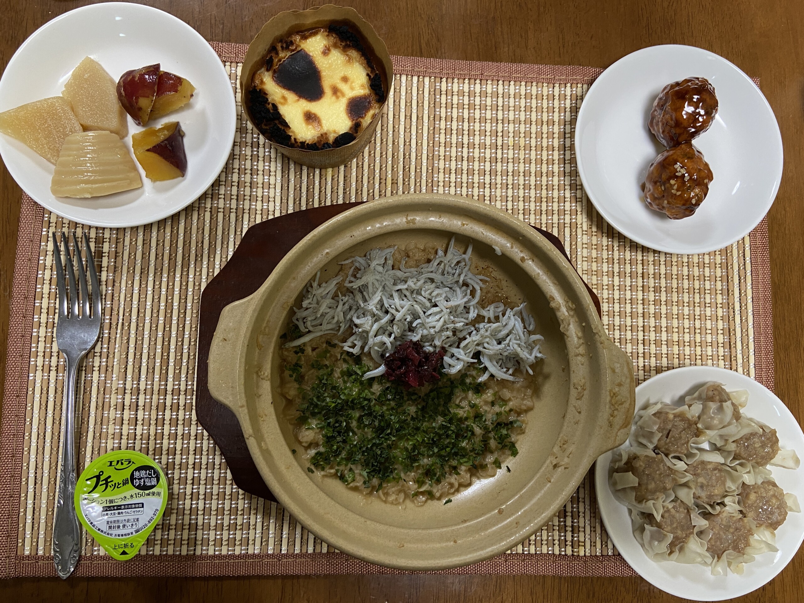 食物繊維ドリンク、オートミール雑炊(鶏塩風)焼売、肉団子、筍の煮物