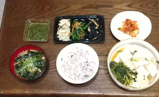 16:00:食物繊維ドリンク、サプリ、バナナ、十六穀米、めかぶ、卯の花、煮物(豆腐・春菊)、ひじき、ほうれん草の胡麻和え、キムチ、味噌汁