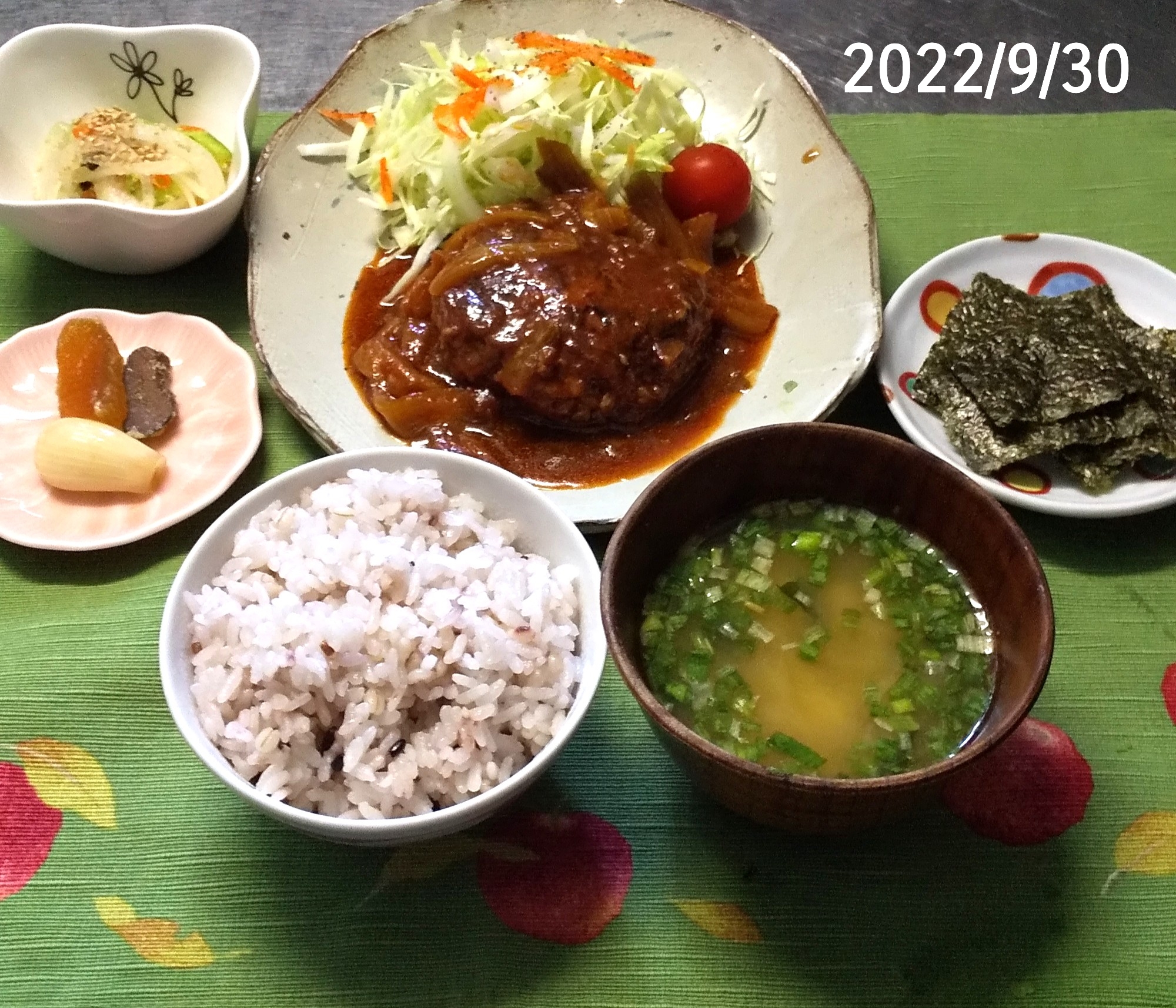 *オートミール入りハンバーグ(チンゲン菜、玉葱)(キャベツ、玉葱、人参サラダ)
