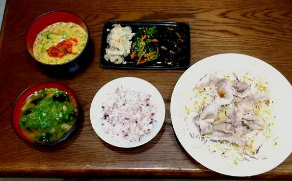 16:00:食物繊維ドリンク、サプリ、バナナ、十六穀米+鮭フレーク、めかぶ納豆キムチ、卯の花、ひじき、ほうれん草の胡麻和え、豚しゃぶ+キャベツ、味噌汁