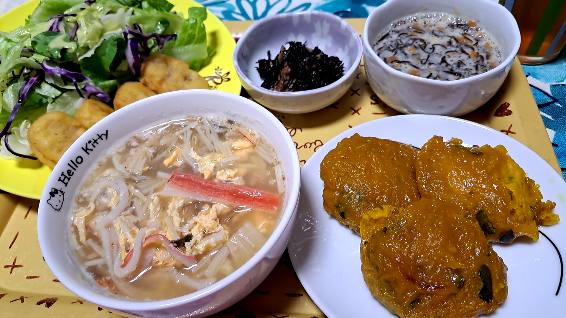 もずく酢納豆 はるさめスープ(えのき、卵入り) カボチャ団子