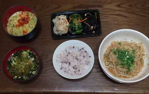 16:00:食物繊維ドリンク、サプリ、バナナ、十六穀米、めかぶ納豆キムチ、卯の花、ひじき、ほうれん草の胡麻和え、もやしと鮭フレークのナムル風、味噌汁