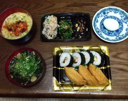 16:00:食物繊維ドリンク、サプリ、バナナ、助六、めかぶ納豆キムチ、卯の花、ひじき、ほうれん草の胡麻和え、ゆで卵、味噌汁
