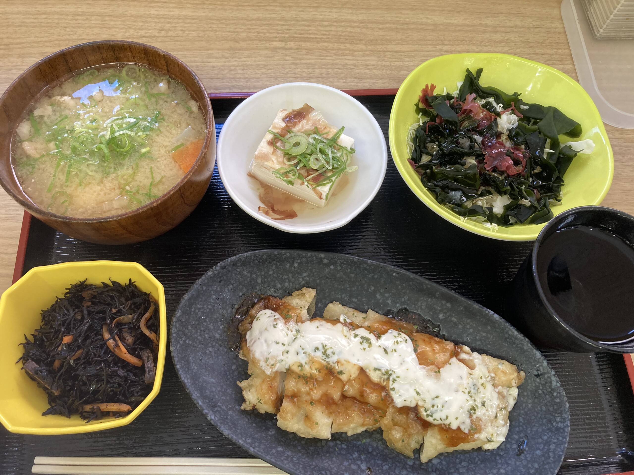 海藻サラダ、ひじきの煮付け、冷奴、鶏肉の南蛮、豚汁。