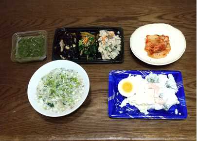 16:00:食物繊維ドリンク、サプリ、低カロリー雑炊+オートミール+えびじゃこ、卯の花、めかぶ、ひじき、ほうれん草の胡麻和え、キムチ、えびとブロッコリーのサラダ、ゆで卵半個
