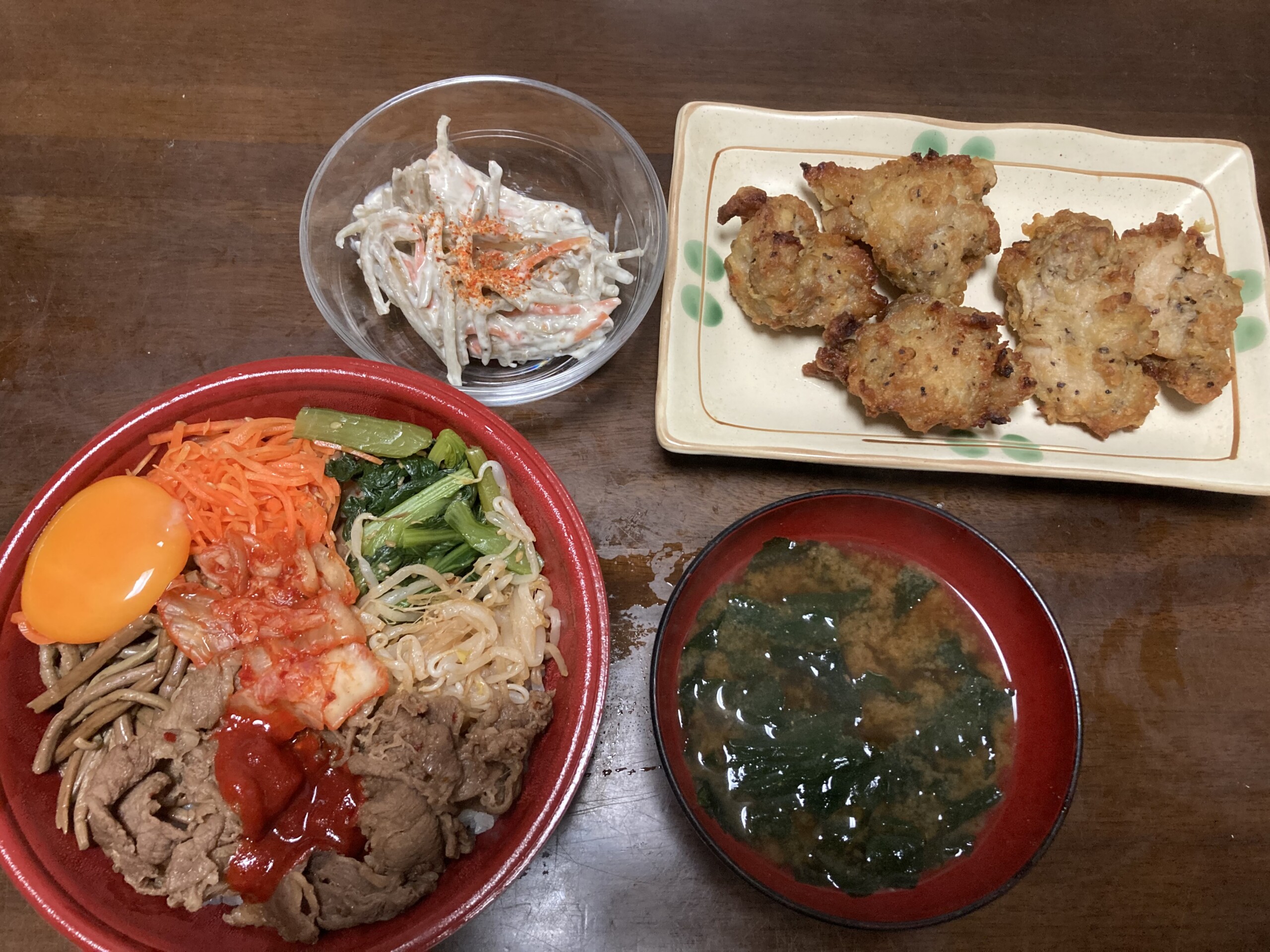 ビビンバ丼、ごぼうサラダ、チキンのオーブン焼、味噌汁