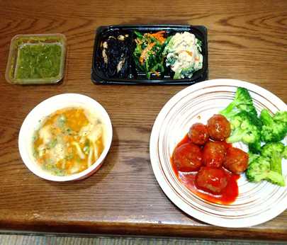 16:00:食物繊維ドリンク、サプリ、カレースープリゾット風(オートミール)、卯の花、ひじき、ほうれん草の胡麻和え、めかぶ、大豆ミートボール、ブロッコリー
