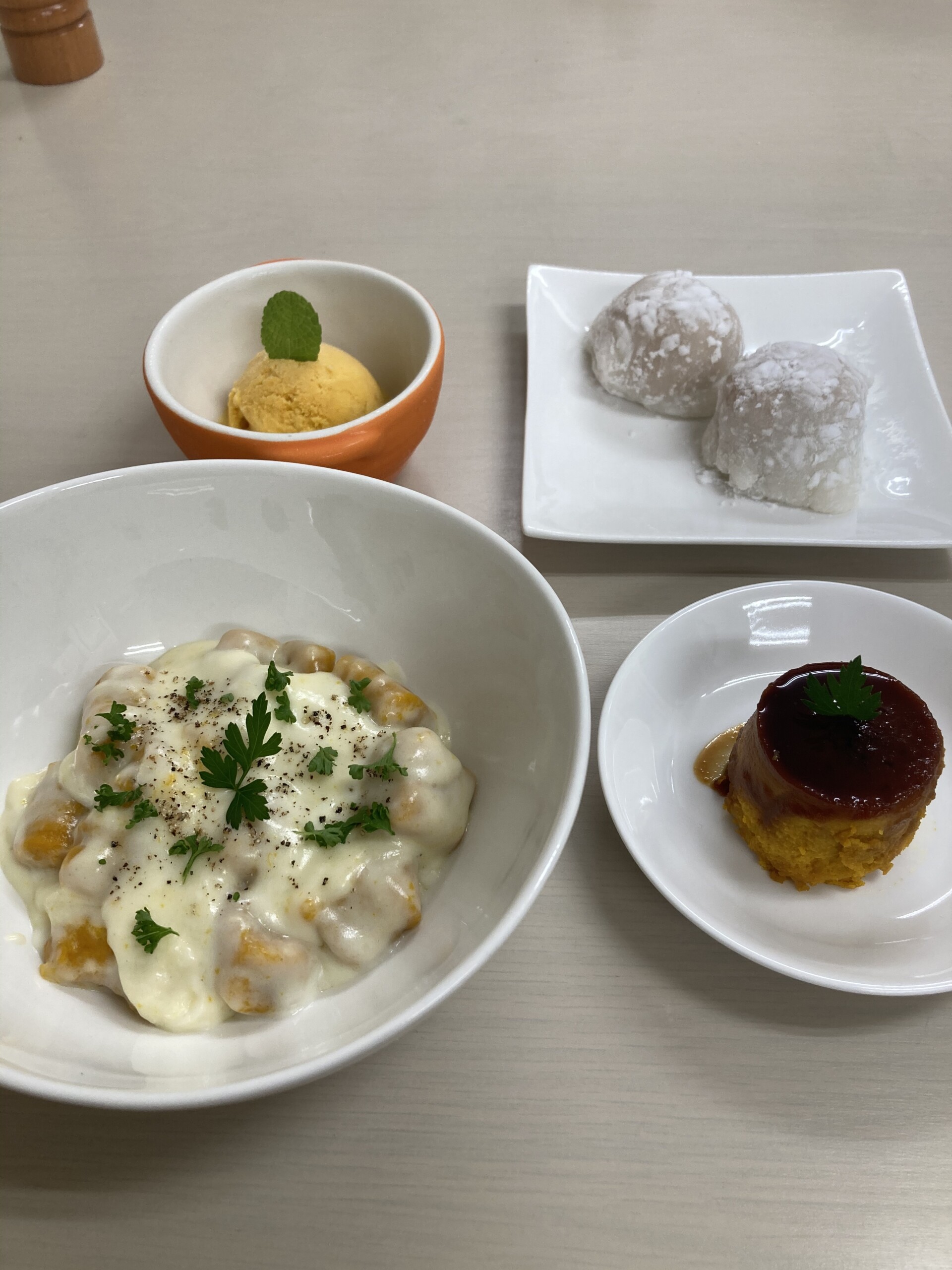 カボチャのアイス、カボチャニョッキのクリーム煮、カボチャ大福、カボチャプリン。