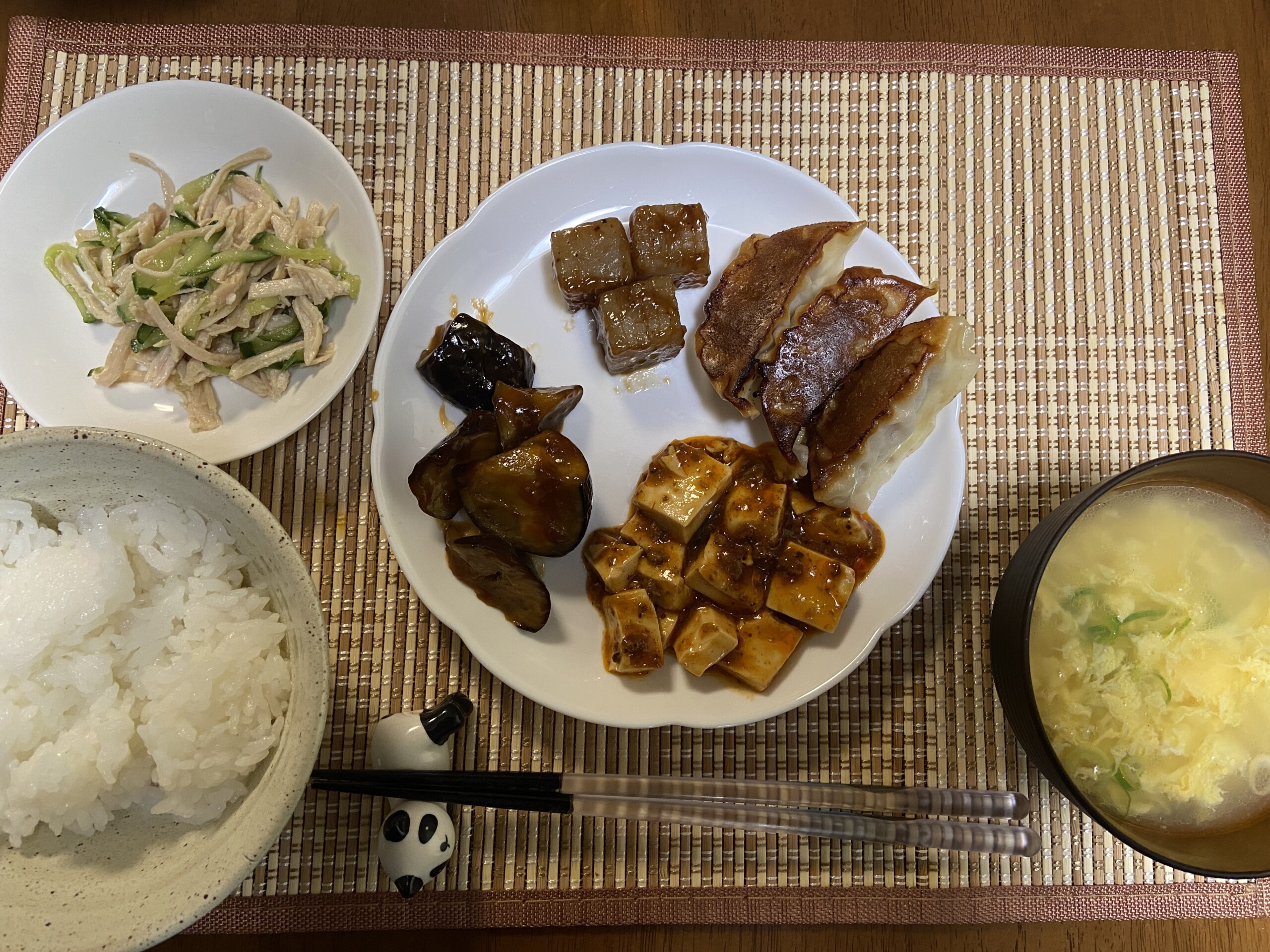 食物繊維、麻婆茄子、餃子、麻婆茄子、和え物、スープ、白米