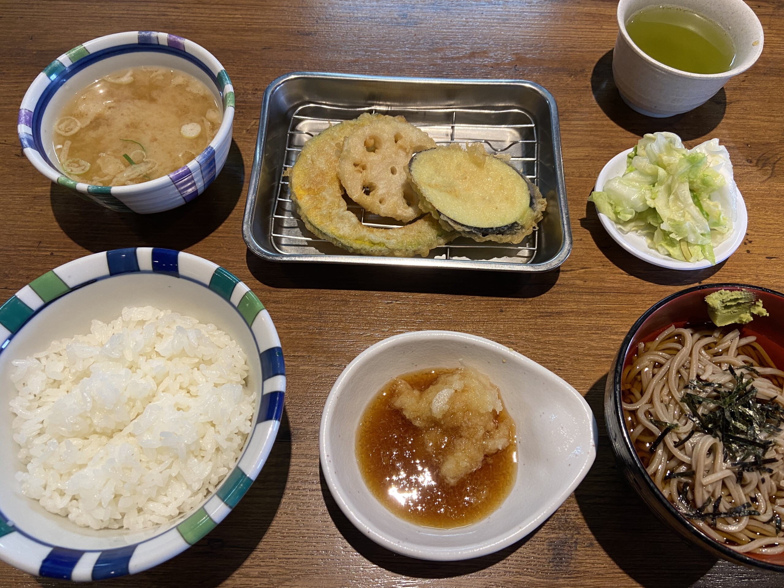 食物繊維、天ぷら(エビ、キス、イカ、かぼちゃ、なす、半熟卵)おそば、ご飯、お味噌汁。