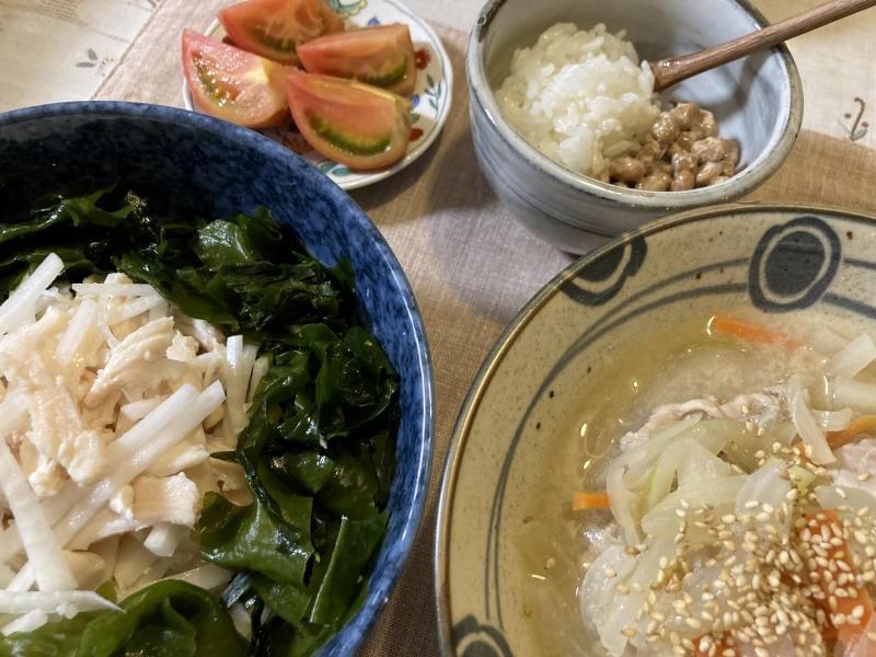 納豆ごはん(ごはん1/2)、鯖ほぐし