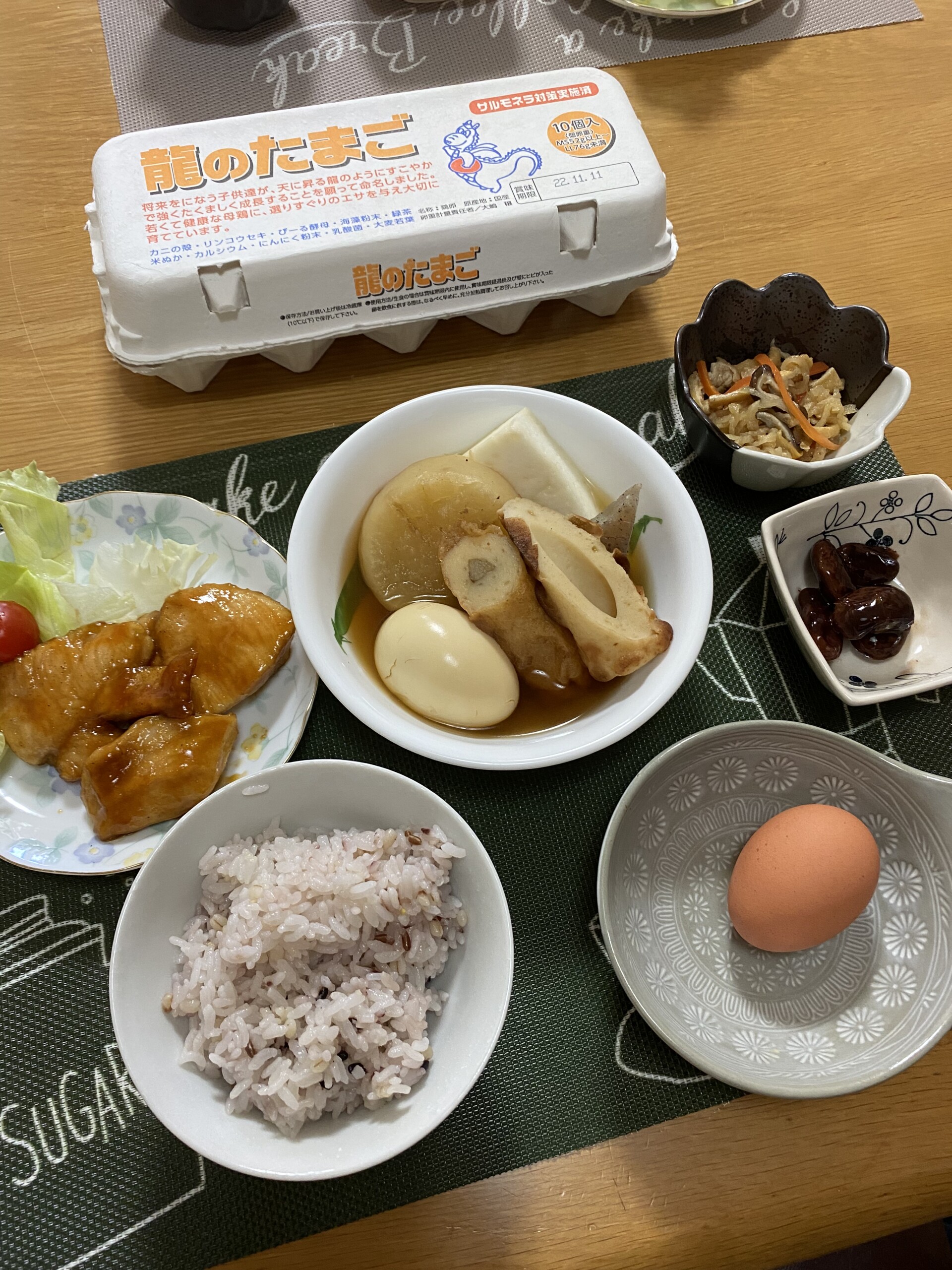 昼食 おでん(大根・卵・蒟蒻・竹輪・ごぼう天・はんぺん)、鶏むね肉甘酢あんかけ、レタス、プチトマト、切り干し大根、福茶豆、十六穀米(卵かけご飯)+サプリ