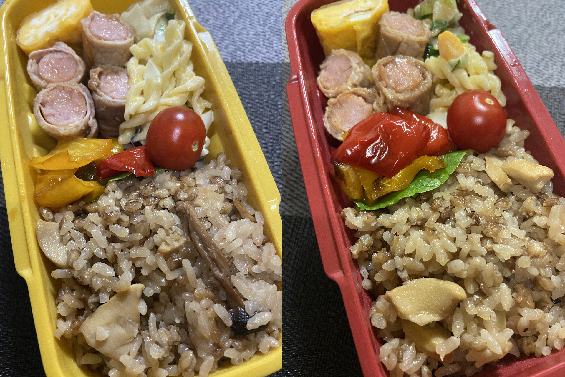 ウィンナーの肉巻き、パプリカのきんぴら、厚焼き玉子