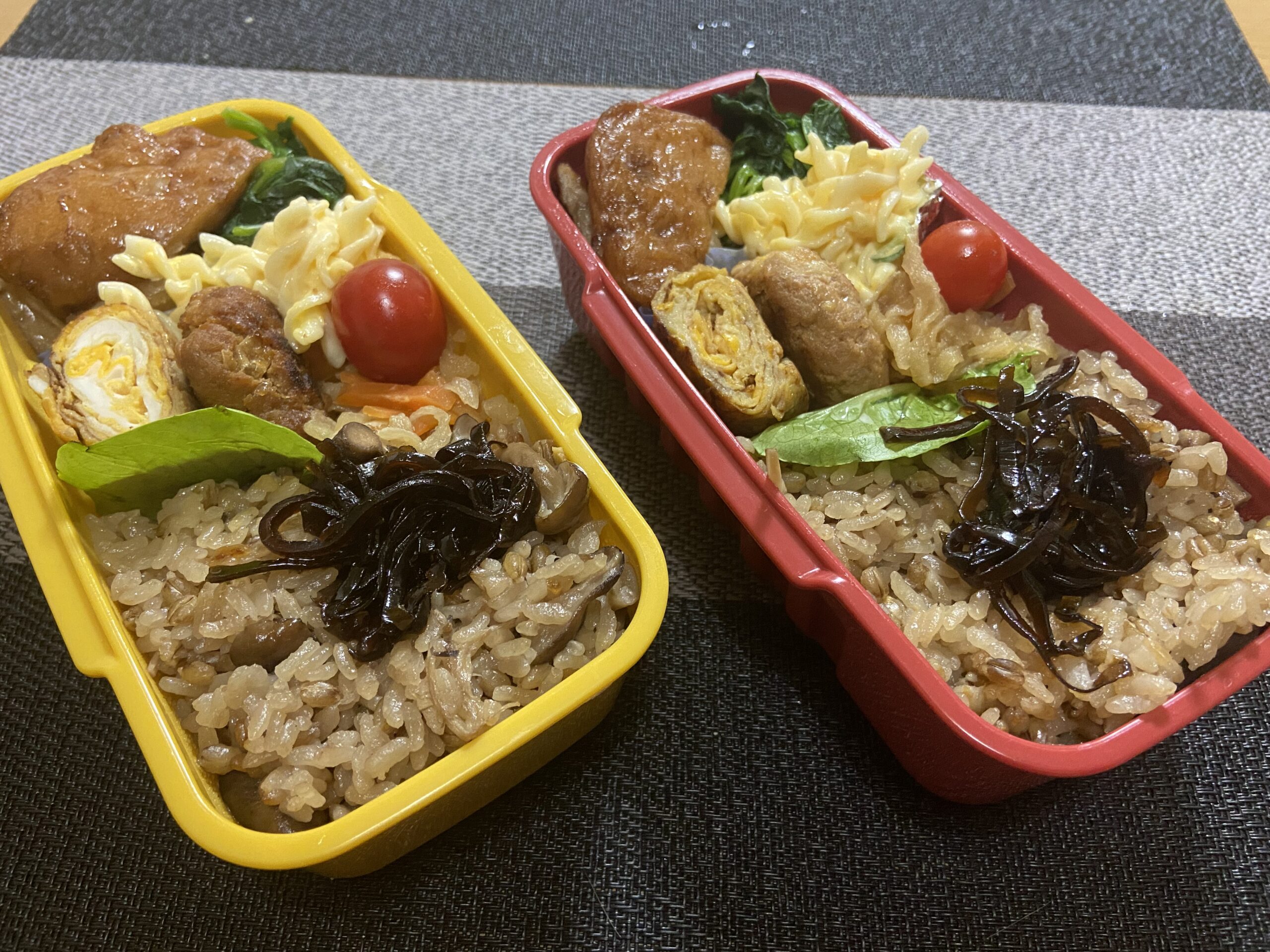 たっぷりキノコごはん(白米。もち麦、椎茸、しめじ、えのき、油揚げ)