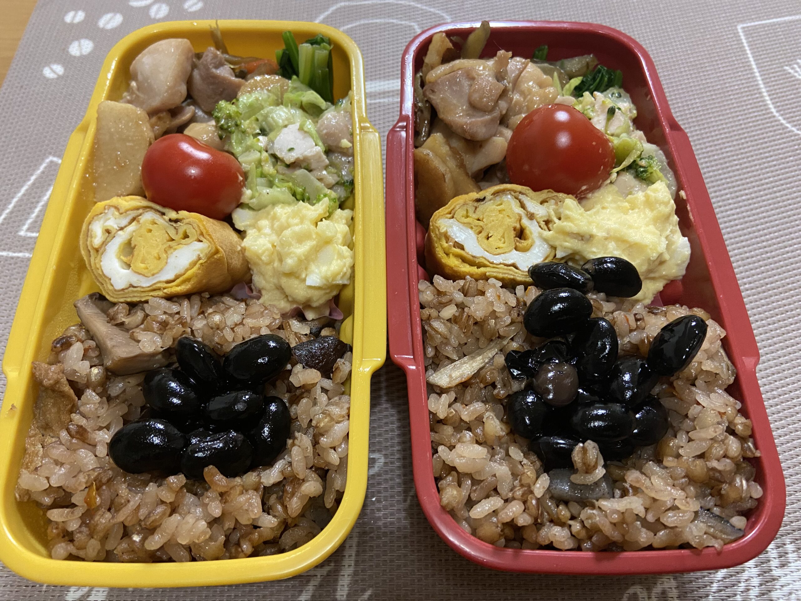 かやくごはん(白米、もち麦、ごぼう、しいたけ、人参、こんにゃく、油揚げ)、黒豆