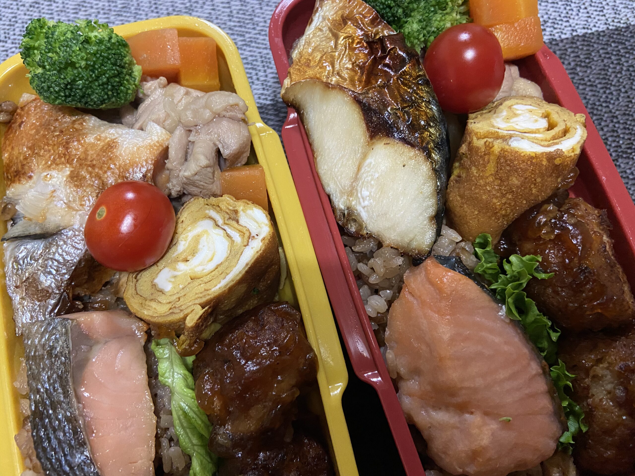 焼き魚:しゃけ さわら、肉団子の甘酢あんかけ、大根と人参と鶏肉の煮物