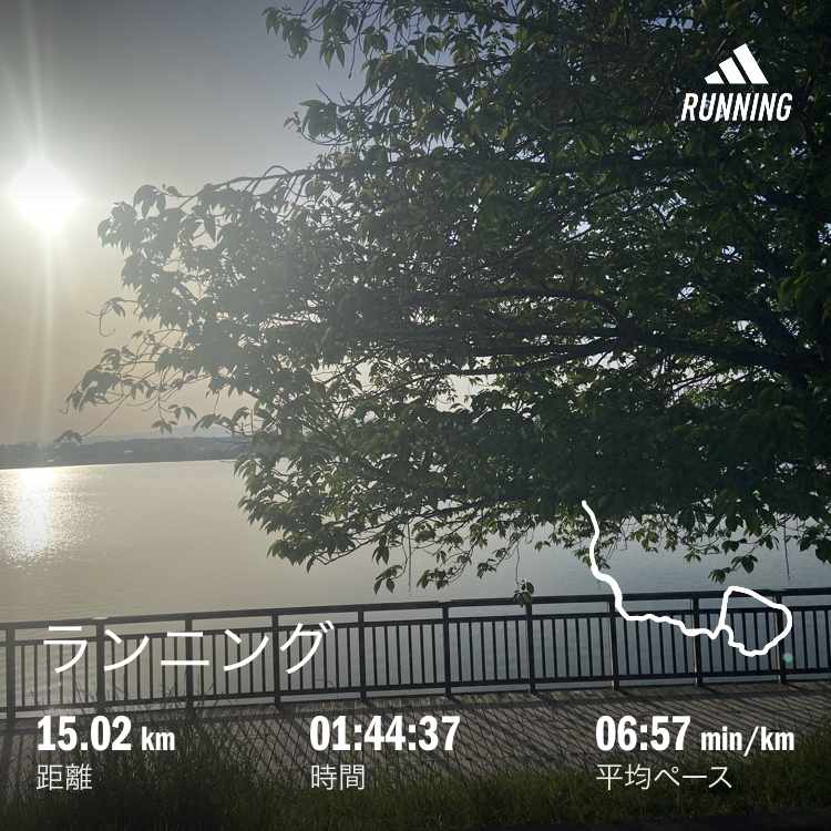 ジョギング 時間:1時間44分、距離:15km、ペース:キロ6分57秒