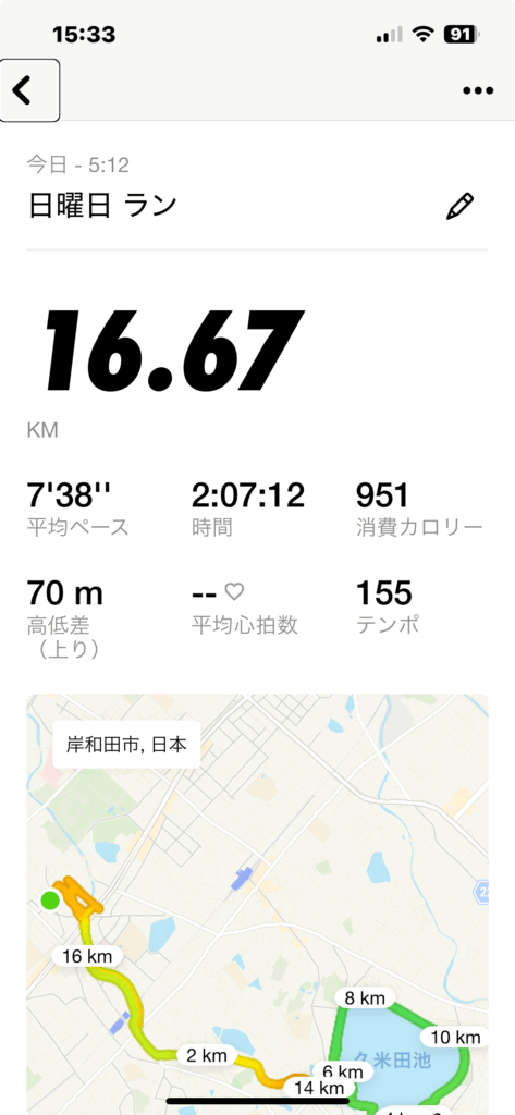トータル 時間:2時間7分、距離:16.7km、ペース:キロ7分38秒