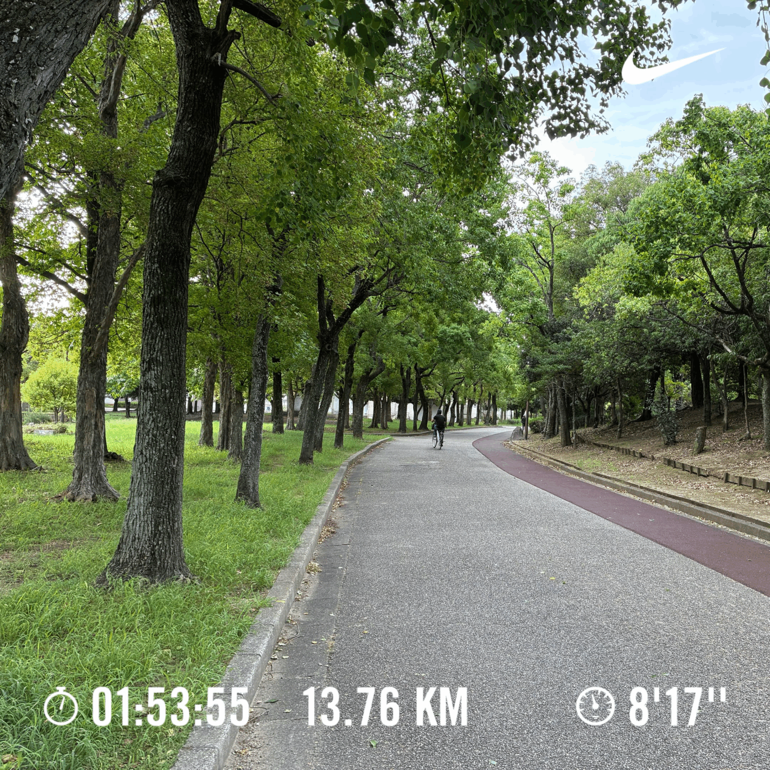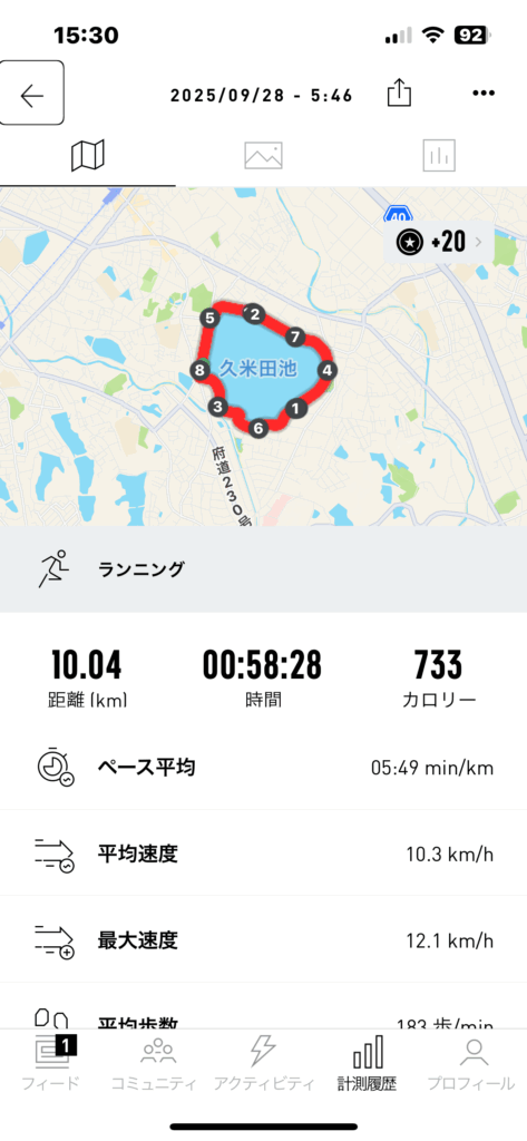 ペース走 時間:58分、距離10km、ペース:キロ5分49秒