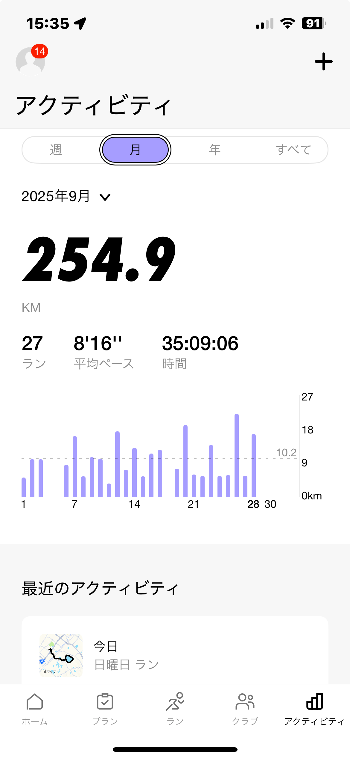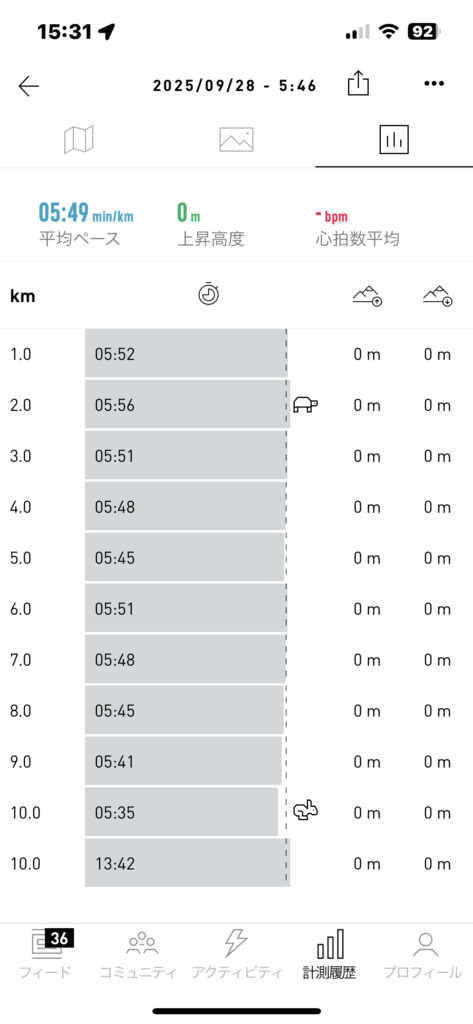9月27・28日(土・日)/週間集計/ペース走、10km、平均ペース5分49秒