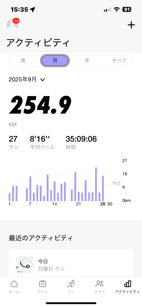 今後はまず、11月2日の淀川ハーフに向けての練習を10月12日の週までしっかりこなし、その後はテーパリング。11月2日のレース後に疲労を抜いてから、3か月かけて大阪マラソンに向けた練習に取り組む予定です。。