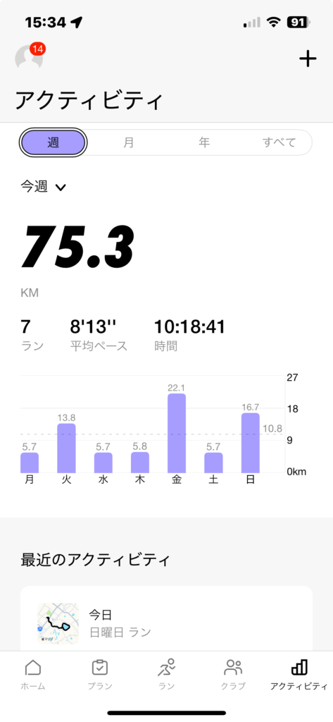 今週は75km走れました。なかなか頑張りましたね。すばらしい😸