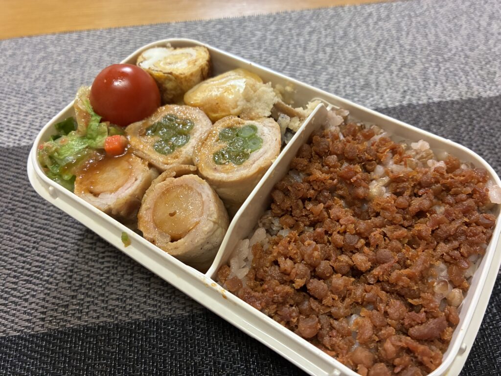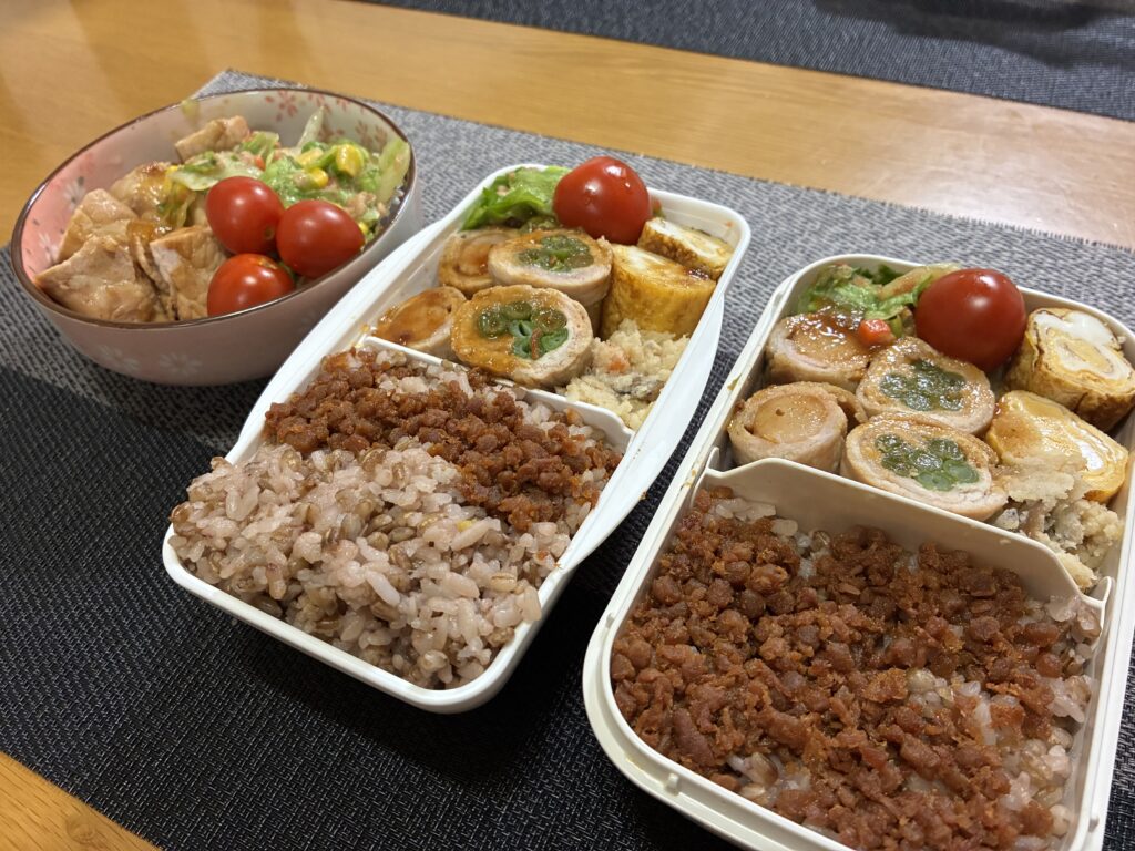 • 主菜:鶏そぼろ、肉巻き(いんげん・ウィンナー)、卵焼き → 鶏と豚でたんぱく質がしっかり摂れます。