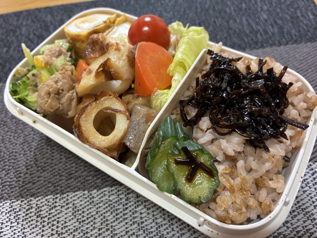10月14日(火)/鶏ももと根菜・さつま揚げ・竹輪の甘辛煮、ブロッコリーとツナのサラダ