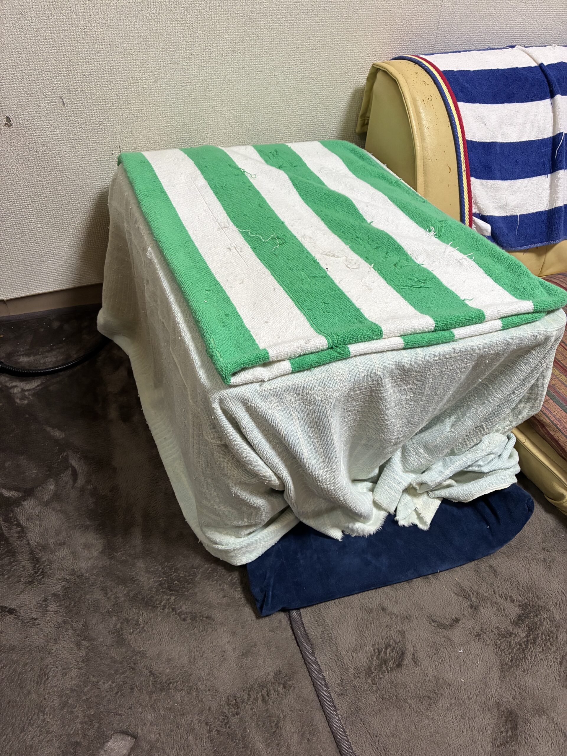そうそう、ホットカーペットを使って作った、あずき専用の「こたつ」。